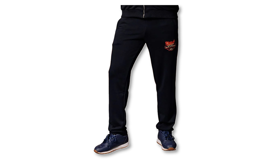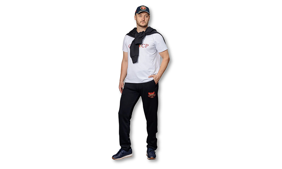 Брюки СССР Моя страна. Внизу без манжетов, прямые. Пояс на резинке. Также есть шнурок, расположенный изнутри пояса, позволяющий дополнительно фиксировать пояс. При желании его можно вытащить и убрать. Спереди вышит дизайн СССР Моя страна 1922. Два кармана по бокам. Оба на молнии. Цвет: темно-синий. Состав: 65% хлопок, 35% полиэстер. Сделано в России.