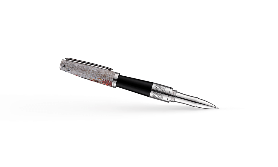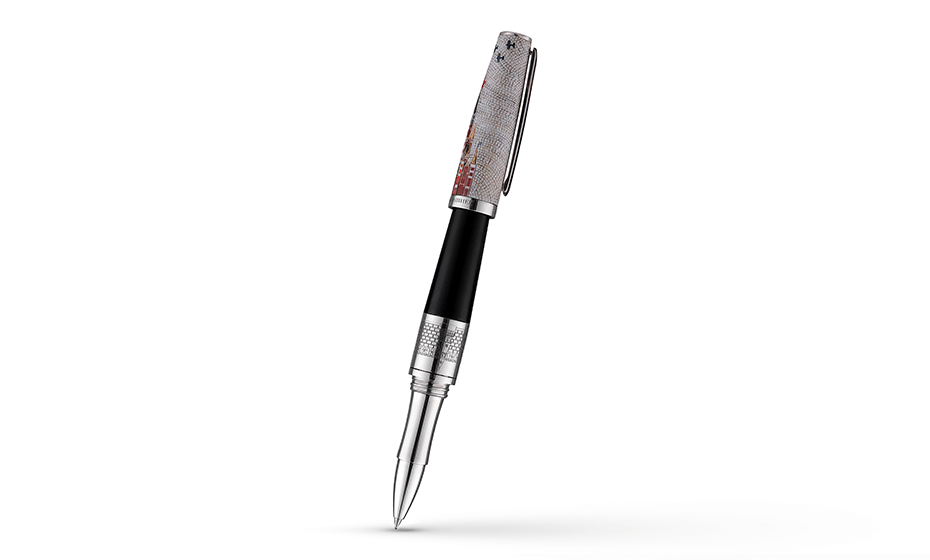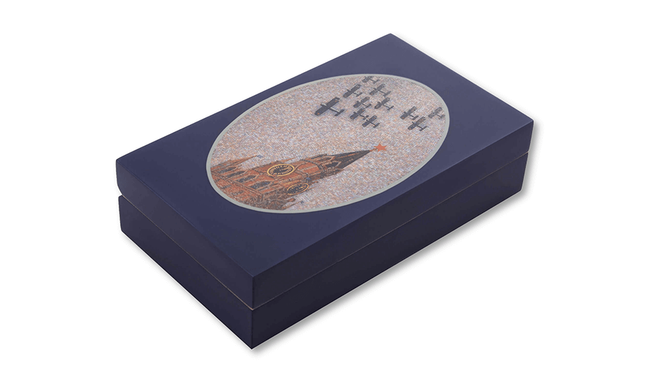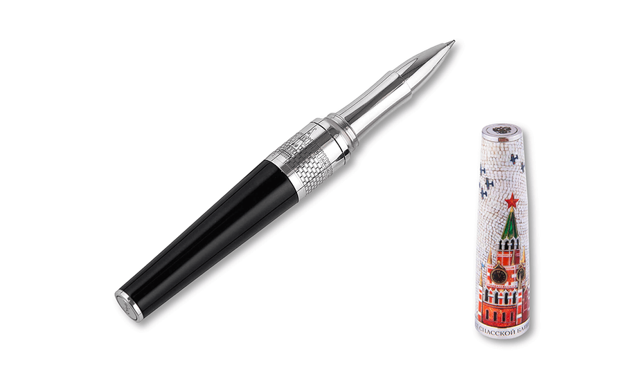 Спасская башня - главноая башня московского Кремля. Изображение этой Кремлевской башни украшает верхнюю часть ручки – оно вручную исполнено в технике папье-маше мастерами Федоскино, которые уже создавали изображения для запонок в данной коллекции. Несколько асимметричное расположение башни уравновешивают парящие над ней три самолета – так что центр композиции находится между ними, что можно рассматривать как символ постоянного движения. Стрелки на циферблате показывают 12 часов–зенит дня.