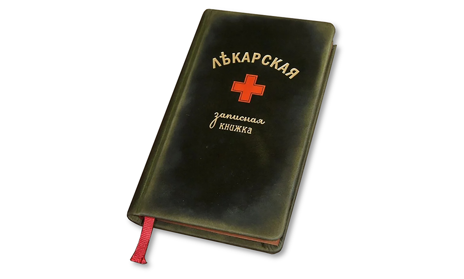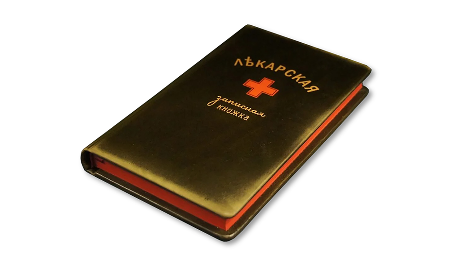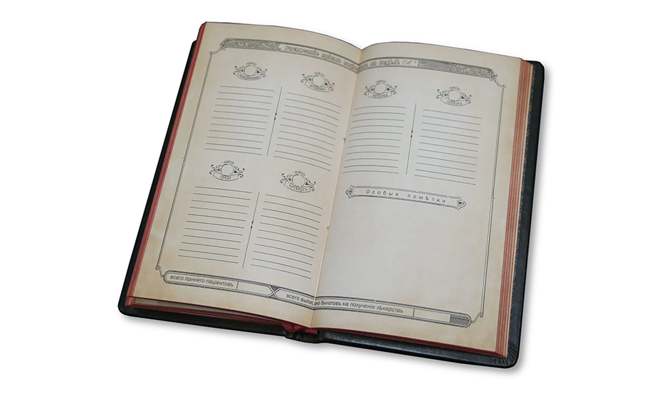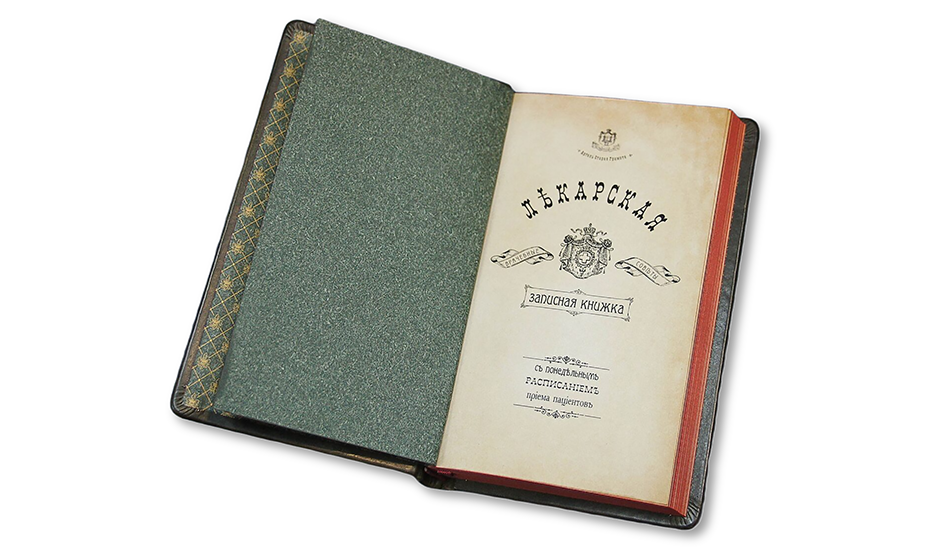 Недатированный ежедневник в стиле XIX века. Лѣкарская записная книжка съ понедѣльнымъ расписанiемъ записи пацiентовъ. Размер 16x23 см.