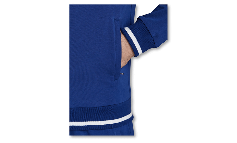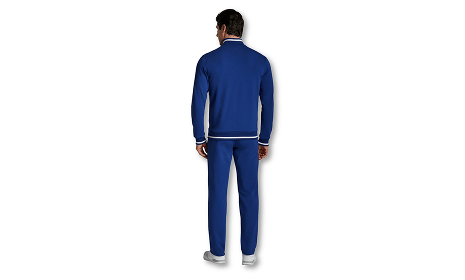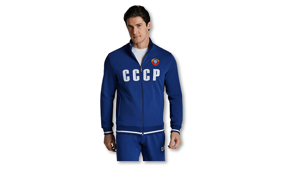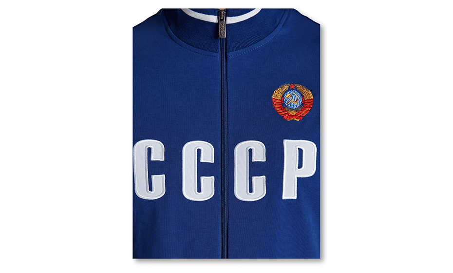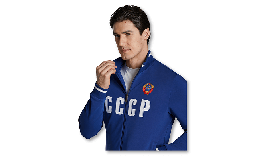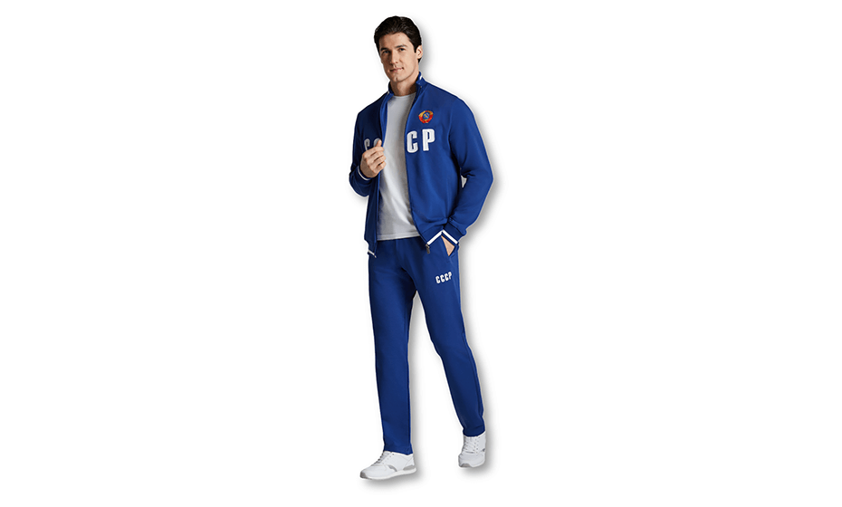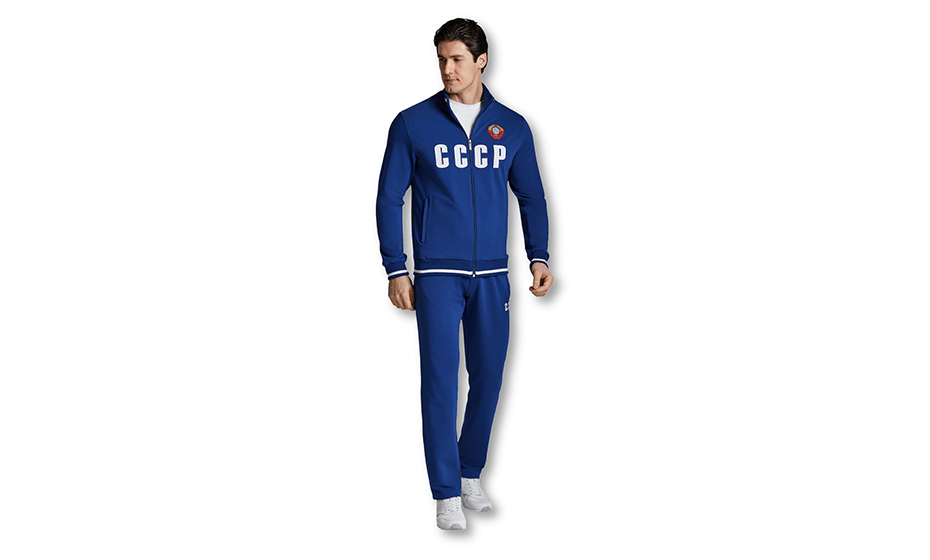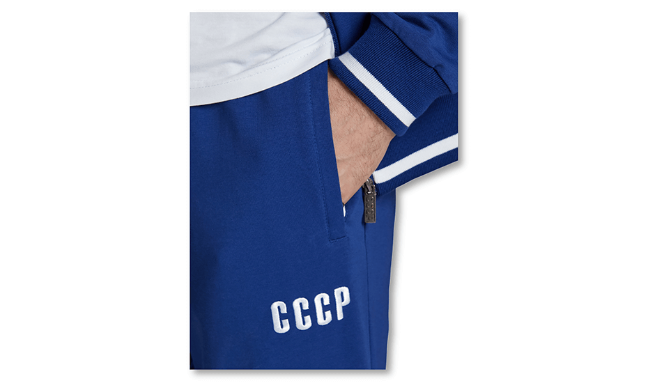 Спортивный костюм из хлопкового трикотажного полотна в ретро-стиле СССР. Куртка костюма на поясе, с воротником, застегивается на молнию. На груди большая вышивка-аппликация СССР. Слева, ближе к плечу, вышивка герба СССР, выполненная цветными шелковыми нитями.Пояс, воротник и манжеты изготовлены из эластичного подвяза с белыми полосами. Карманы куртки и брюк прорезные, на молниях. Брюки прямого силуэта, слегка заужены книзу. Под левым карманом брюк вышивка СССР.