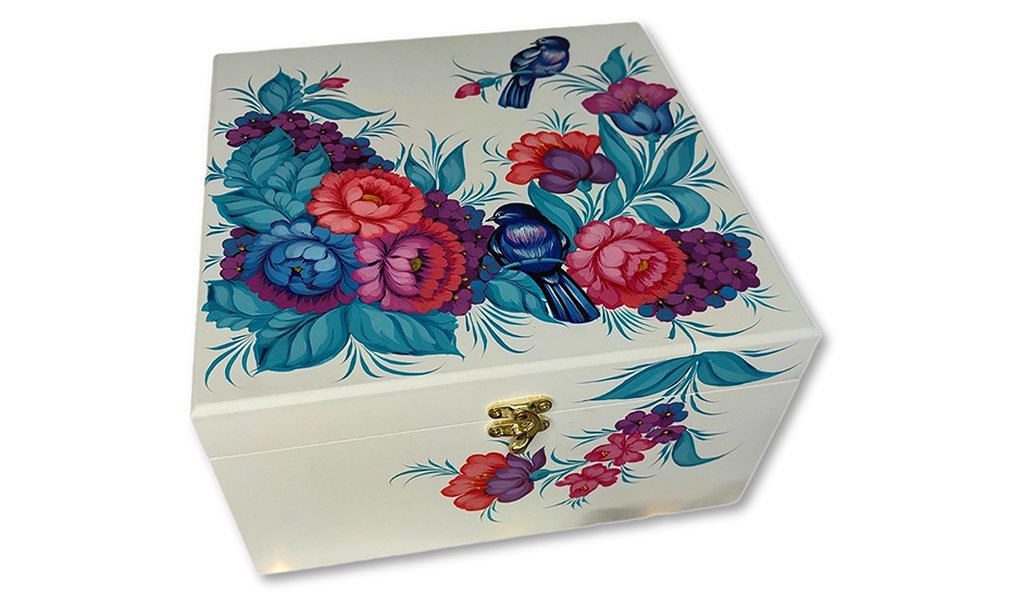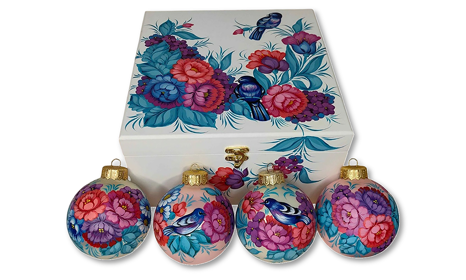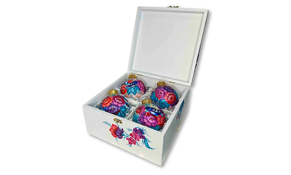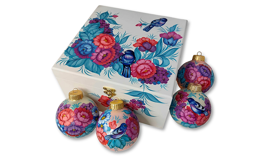 Шары упакованы в элегантный деревянный ларец ручной работы, расписанный цветочными узорами, которые перекликаются с росписью шаров. Внутри — мягкая шелковая подкладка, подчёркивающая премиальный статус ансамбля. Ларец не просто упаковка, а полноценная часть художественного произведения, достойная коллекции или подарка.