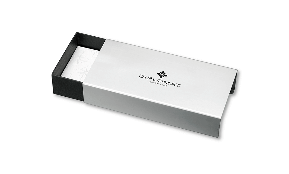 Солидная перьевая ручка Diplomat Excellence A Plus. Корпус ручки полностью изготовлен из металла и имеет матовое черное покрытие с рисунком в виде серебристых линий-гильоше, которые преломляют лучи и очень красиво играют на свету. Они напоминают волны на песке, созданные ветром в самом сердце пустыни Сахара. Декоративные элементы отделки – хром. Грип-секция покрыта глянцевым чёрным лаком.