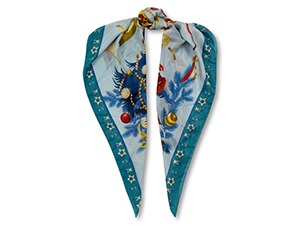 Платок предлагается в двух цветовых решениях — нежно-голубой фон и бирюзовая орнаментальная кайма или фон насыщенного синего оттенка navi и кайма темно-голубого цвета.