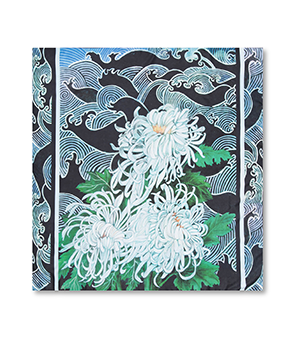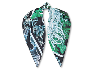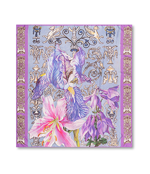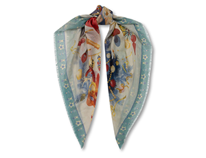 Платок предлагается в двух цветовых решениях — нежно-голубой фон и бирюзовая орнаментальная кайма или фон насыщенного синего оттенка navi и кайма темно-голубого цвета.