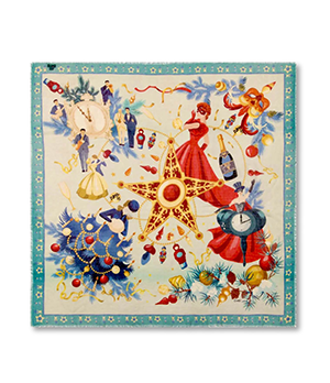 Красная пятиконечная звезда — елочная, но похожая на кремлевскую — в композиционном центре платка напоминает о бое кремлевских курантов в полночь 31 декабря, возвещающем наступление Нового года.