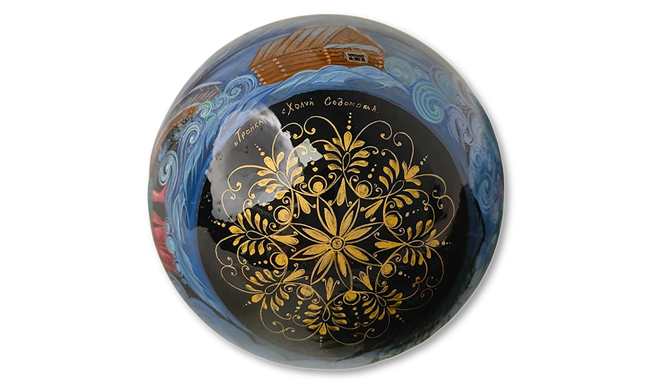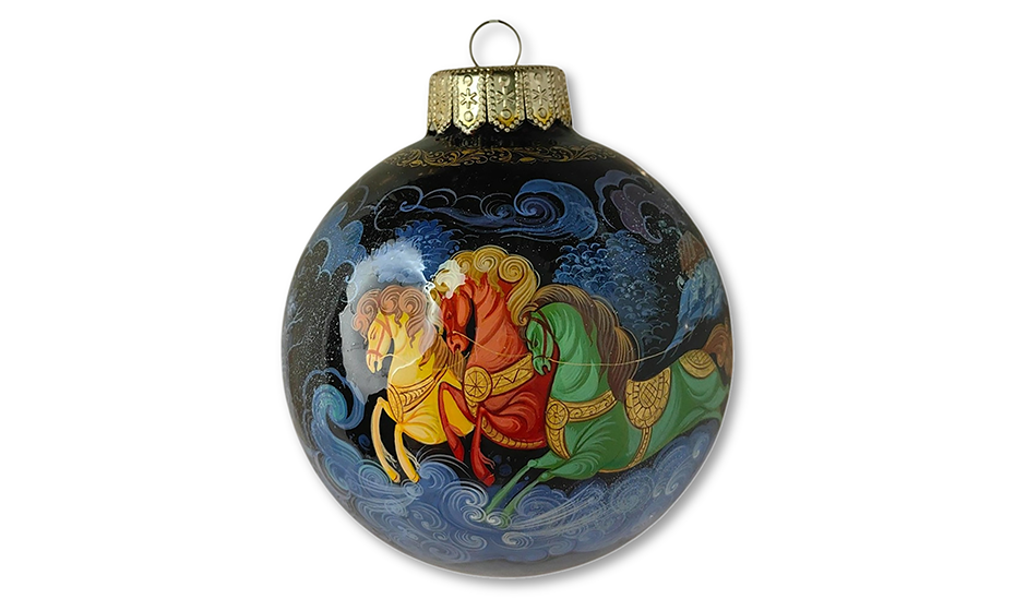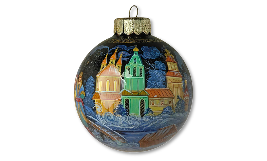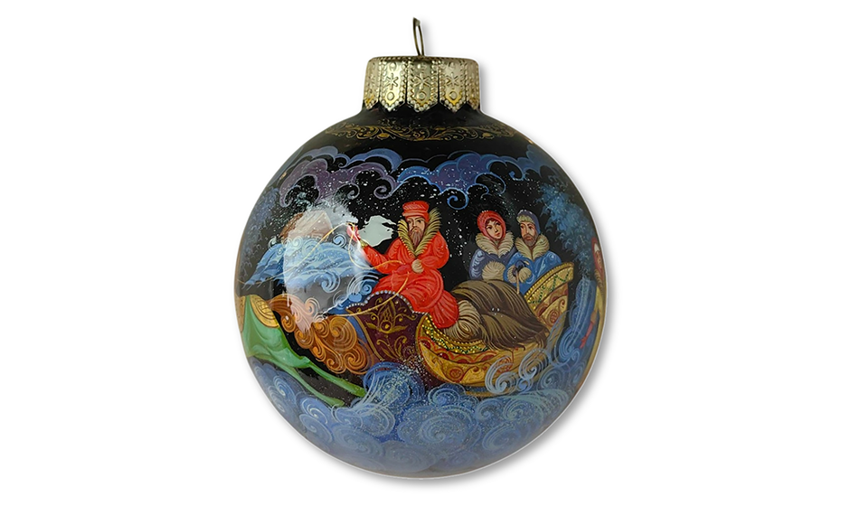 Праздничный шар из лимитированной коллекции интернет-магазина «Ферма Радости», расписанный вручную в технике Холуй — одном из знаменитых центров русской лаковой миниатюры. Диаметр стеклянного шара — 100 мм.