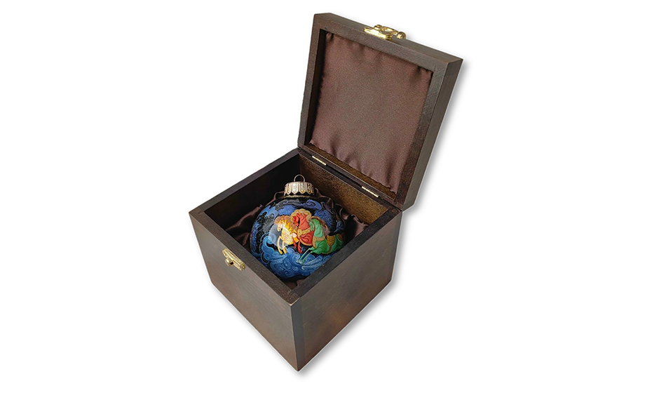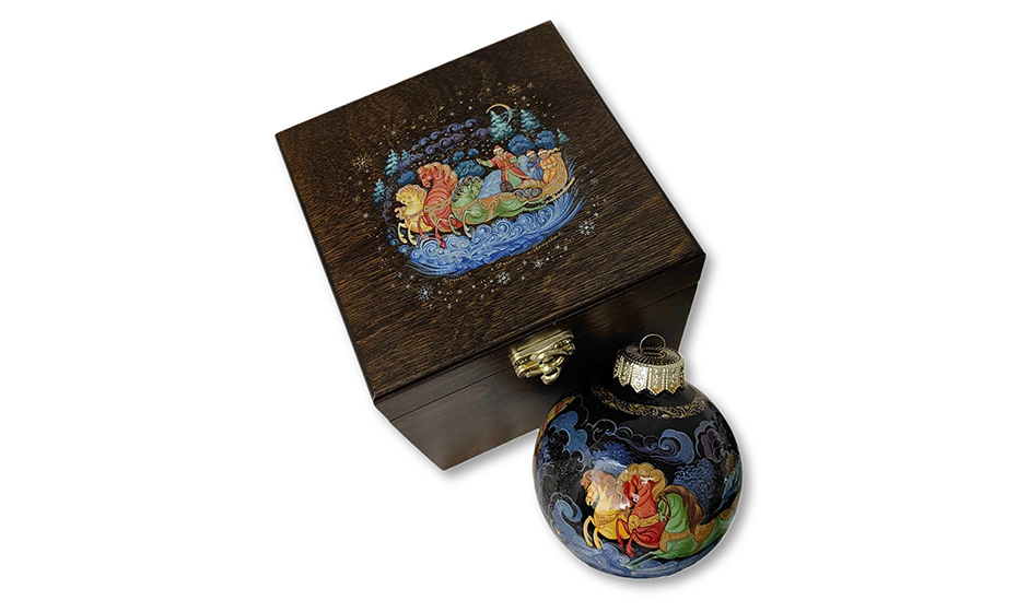 Шар упакован в резной деревянный ларец с ручной росписью на крышке — сцена в том же стиле с яркой «тройкой» и зимним пейзажем. Внутри — шелковистая подкладка.
