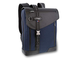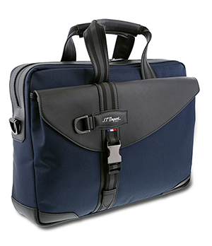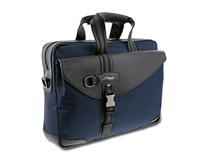 Сумка с съемным плечевым ремнем S.T. Dupont "Defi Millenium" на молнии, синий нейлон, вставки: гладкая черная кожа. Размер: 29 х 41 х 10,5 см. Мягкое отделение для ноутбука. Основной карман на молнии. Внутри две петли для ручек. Снаружи клапан с системой закрытия. Светоотражающая лента. Способна выдержать любые погодные условия и высокие нагрузки.